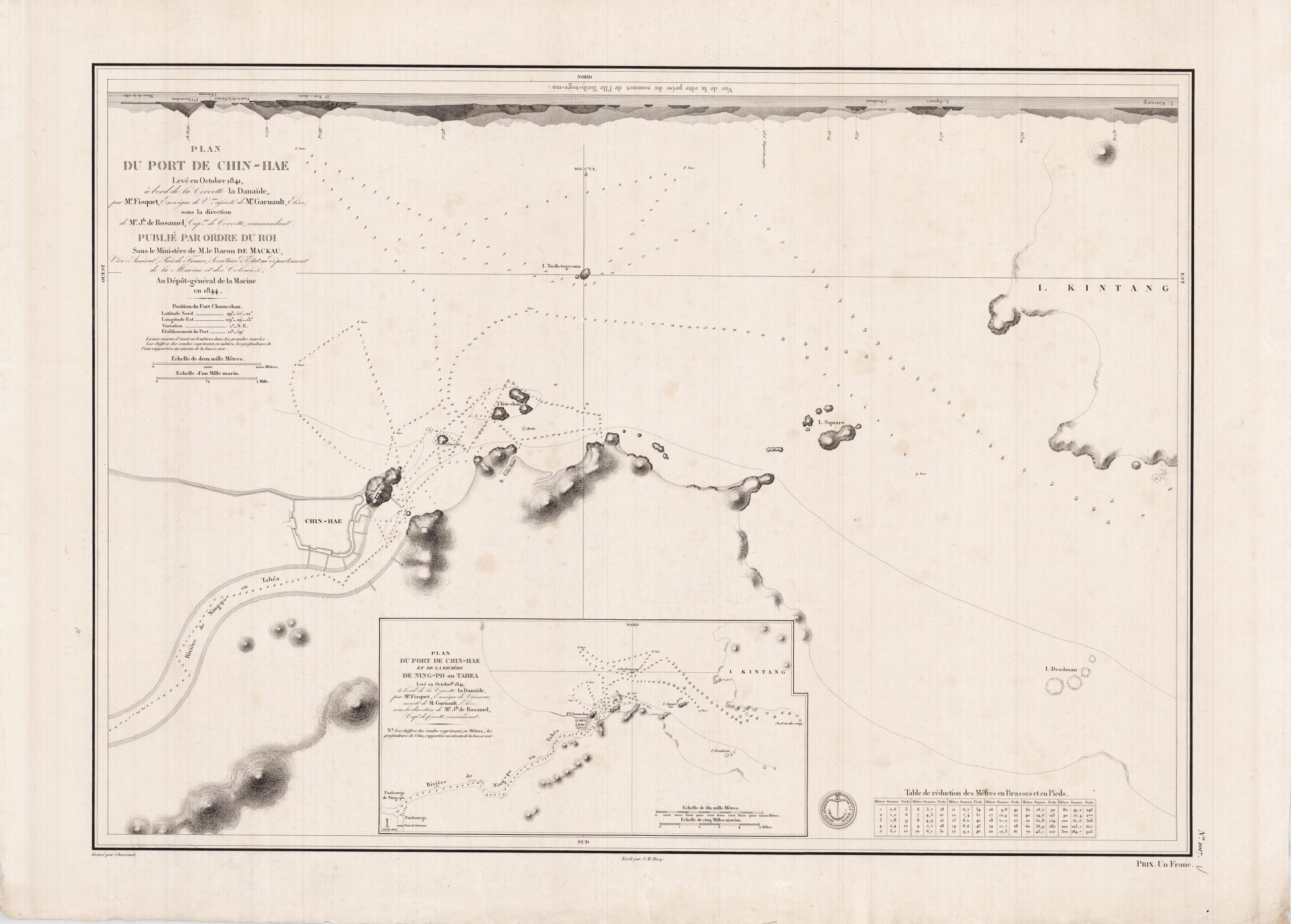 Plan du port de Chin-Hae Infällt kort: Plan du port de Chin-Hae et de la rivière de Ning-Po ou Tahea Atlas 13 kort 1017 År 1844 Storlek 65×59 cm