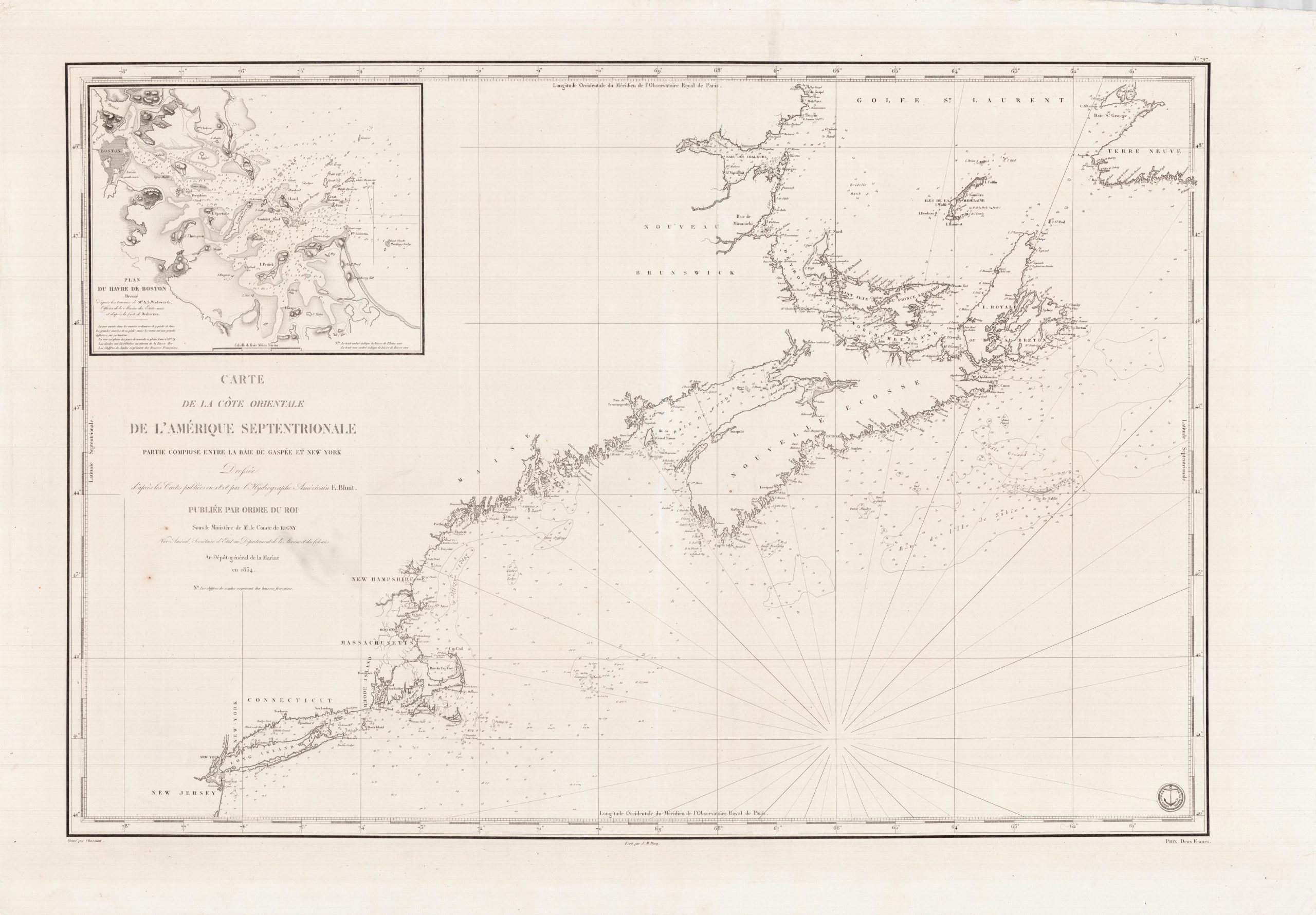 Carte de la côte orientale de l’Amérique septentrionale, partie comprise entre la baie de Gaspée et New-York Infällt kort: Plan du havre de Boston Atlas 14 kort 0797 År 1834 Storlek 59×65 cm