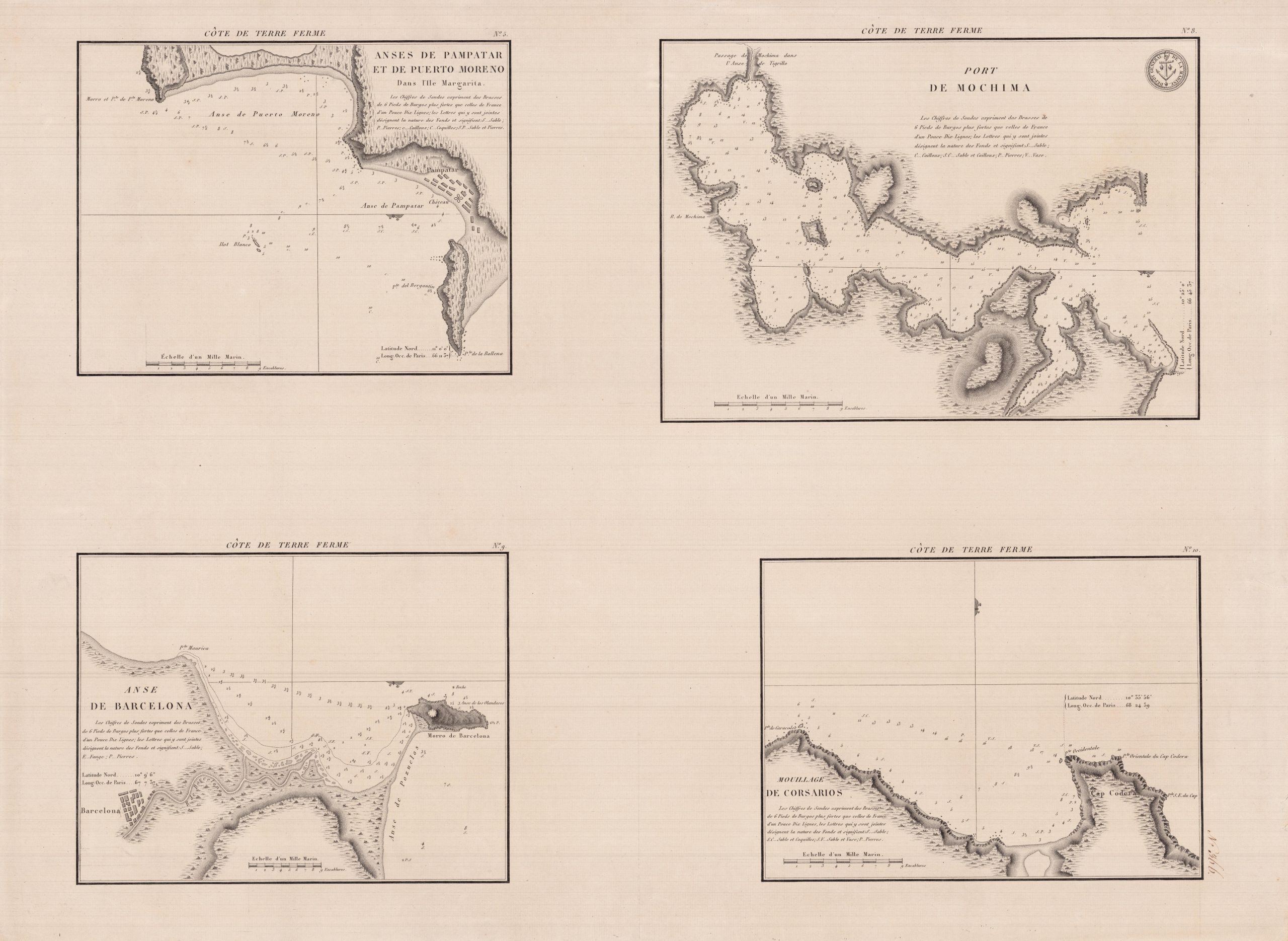 Anses de Pampatar et de Puerto Moreno. Anse de Barcelona. Port de Mochima. Mouillage de Corsarios 4 kort. Atlas 15 kort 0366 År okänt Storlek 59×65 cm