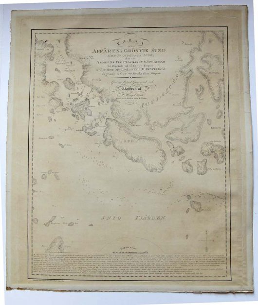 Gravyr, kopparstick. Ritad av …… Fischerström Höjd: 37,0 cm, Bredd: 44,5 cm. BATAILLEN vid KÖPENHAMN 1801, den 2de april kl. omkring 10 fm lyfte...